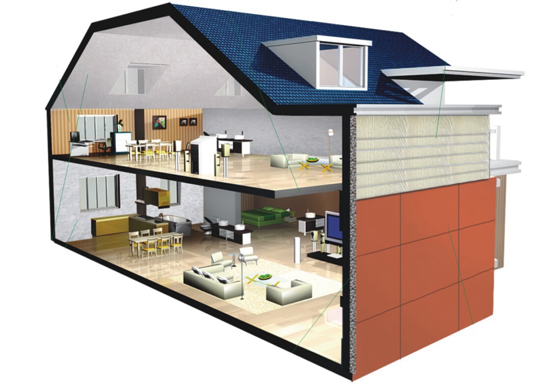 在鋪設好地基和水泥(鋼)結構框架后:用合谷輕質復合板做外墻和室內隔墻,用合谷裝飾板做室內裝飾;合谷基礎板做天花板;合谷閣樓板配合鋼結構框架做樓承地板;用合谷木紋板或合谷全色板做外墻裝飾。